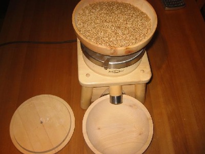 Jetzt geht es rund, hat das Körnchen gesagt als es in die Mühle rutschte. Und das ist für unsere neue Mitarbeiterin Erica überhaupt kein Problem, sie schafft bis zu 10 kg Feinschrot in der Stunde.